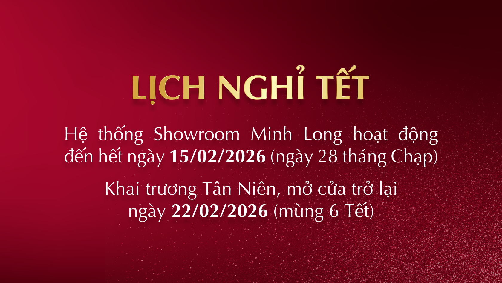 Nhằm giúp Quý Khách Hàng chủ động kế hoạch mua sắm và nhận hàng trong dịp Tết Nguyên Đán 2026, Minh Long trân trọng thông báo lịch nghỉ Tết Nguyên Đán và thời gian ngưng nhận đơn hàng online của các kênh như sau: