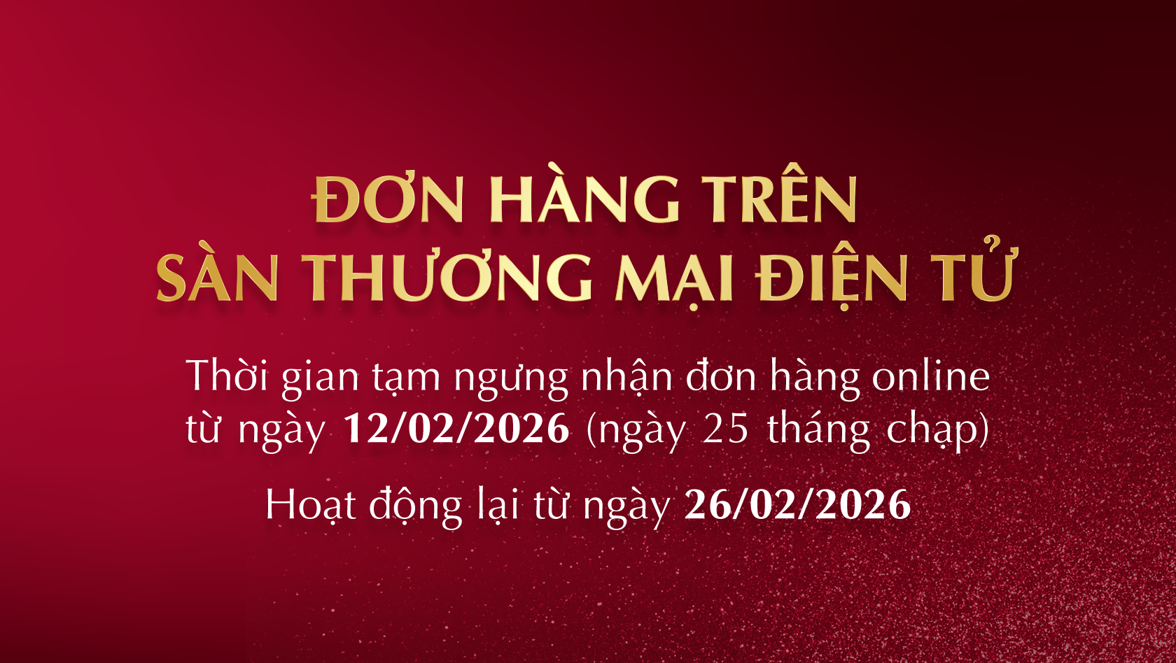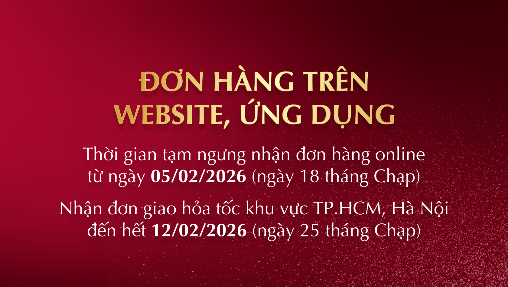 - Ngưng nhận đơn hàng: Từ ngày 12/02/2026 (nhằm ngày 25 tháng Chạp)